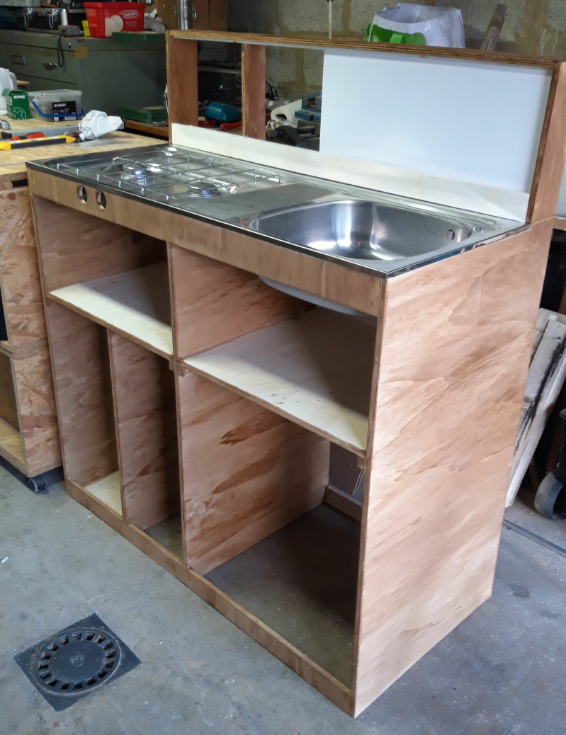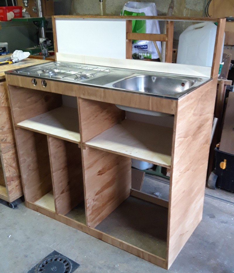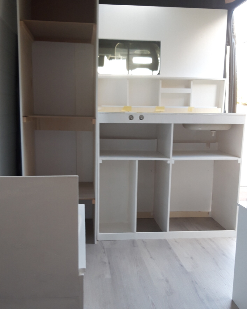 De basis van de keukenblok heb ik gemaakt toen de bus weg was voor de ramen.